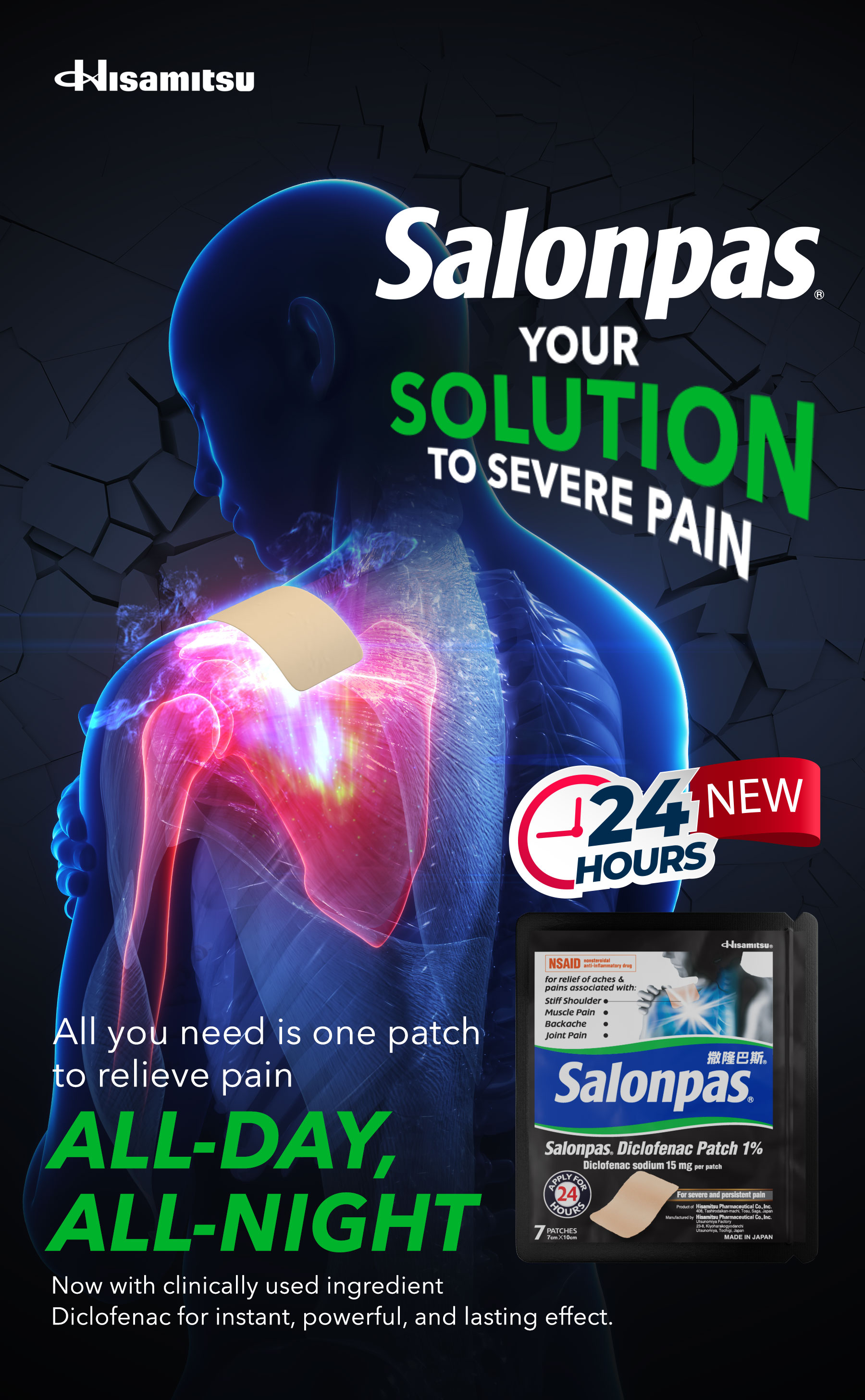 Hisamitsu Pharmaceutical aimed to introduce Salonpas® Diclofenac Patch 1% to the Singapore market by emphasizing its 24-hour pain relief and deep penetration technology. The campaign focused on shifting the narrative from product attributes to real-life applications, highlighting how the patch empowers users to maintain active lifestyles without pain. This approach increased awareness, drove trial, and strengthened brand trust.